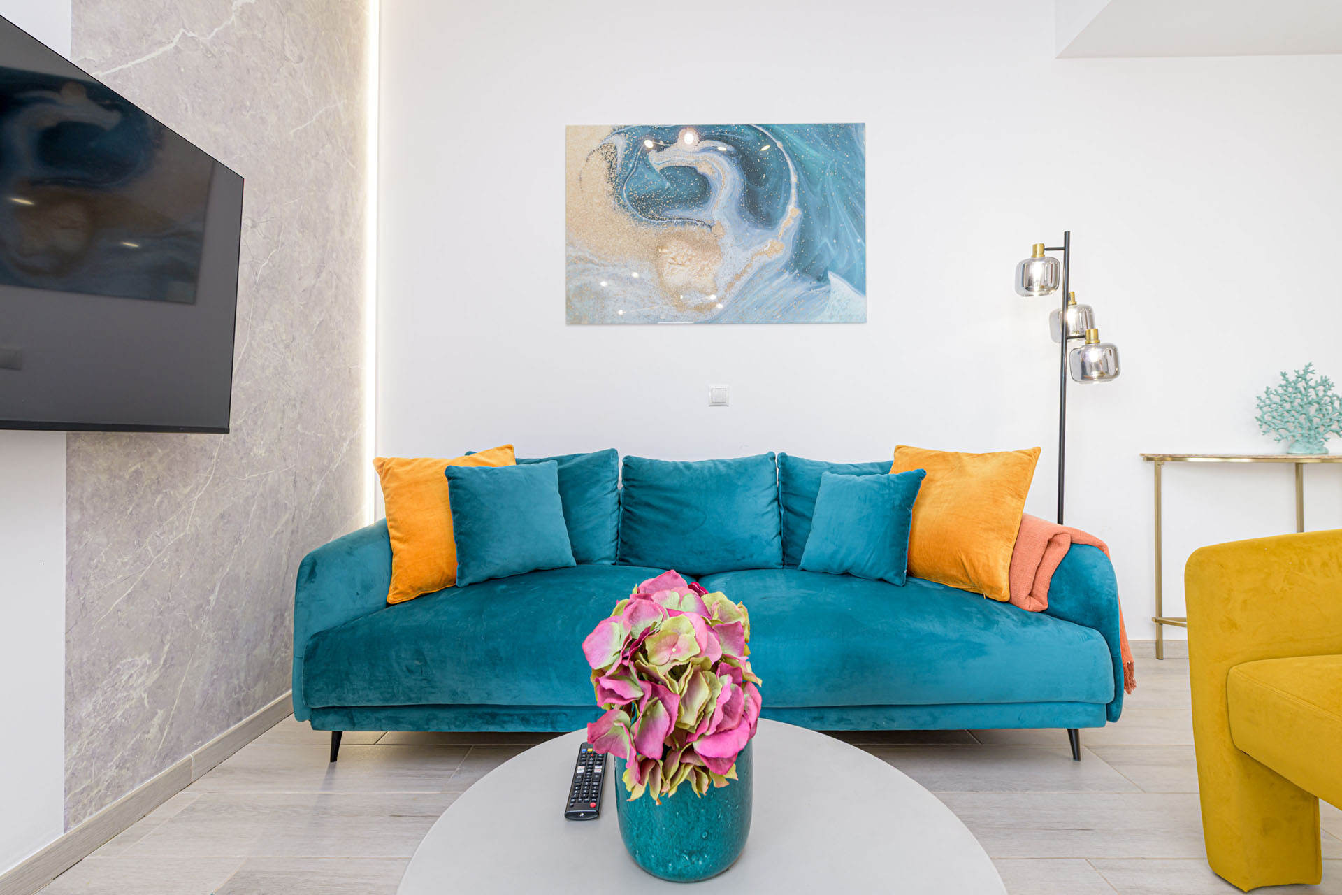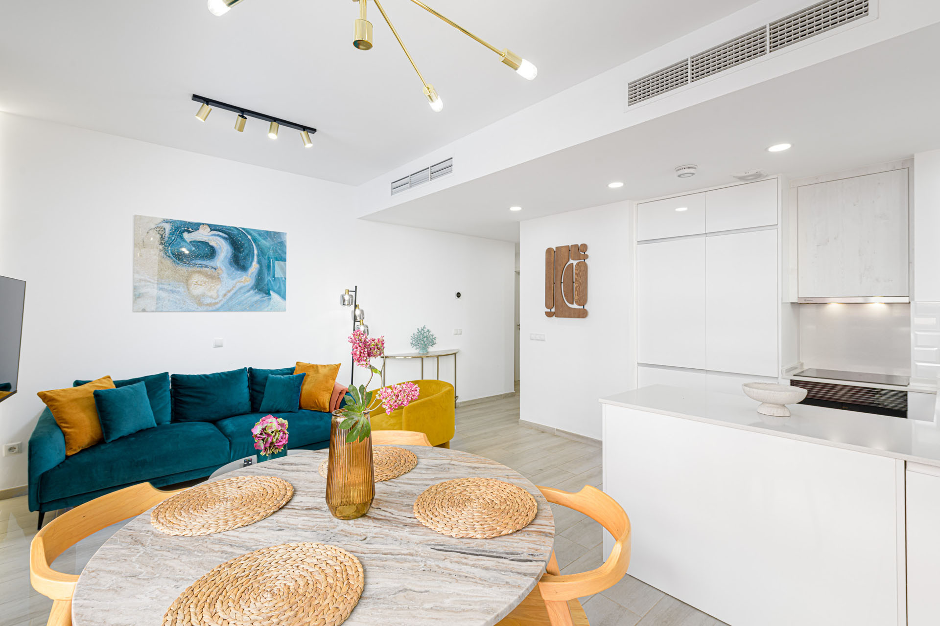 L'appartement dispose d'une cuisine de style américain entièrement équipée avec tous les essentiels, comprenant une plaque de cuisson à induction, un réfrigérateur, un congélateur, un lave-vaisselle, un four, un micro-ondes, une machine à café et un ensemble complet d'ustensiles de cuisine. Restez connecté grâce au WiFi gratuit et profitez du divertissement sur la télévision fournie.