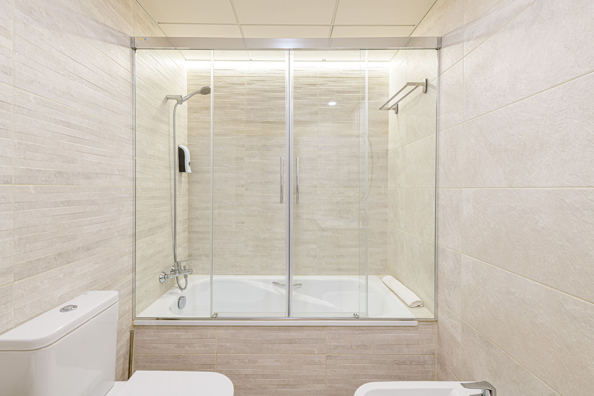 Le confort est essentiel dans cet espace bien conçu, avec la climatisation et une pompe à chaleur garantissant une température agréable tout au long de votre séjour. L'appartement comprend deux salles de bains - l'une avec une douche et l'autre avec une baignoire - offrant un confort pratique pour tous les invités. Un fer à repasser pratique est également disponible pour vos besoins vestimentaires.